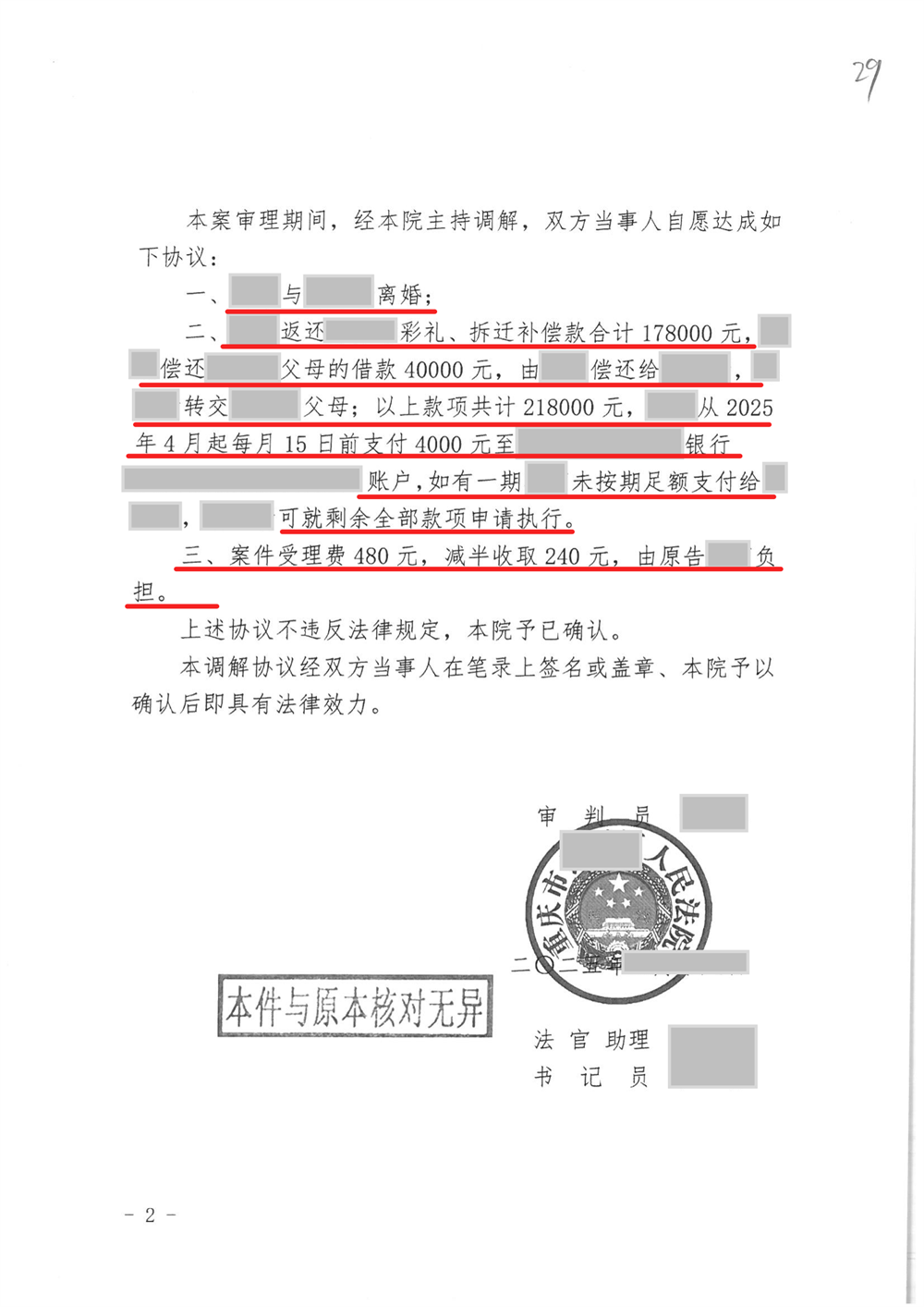 法院出具的民事调解书与离婚证具有同等法律效力,姜女士按约返还彩礼、拆迁款等款项。该婚姻纠纷案件顺利办结,为双方当事人开启了新的生活篇章。
