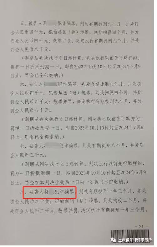 本案共13名被告人,经石柱县人民法院审理后择期宣判,判决结果是:委托人委托人犯诈骗罪,判处有期徒刑一年三个月;犯偷越国(边)境罪,判处拘役两个月;数罪并罚,决定执行有期徒刑一年三个月,缓刑一年六个月。本案因庭前沟通确认可判处缓刑后才与委托人协调退缴违法所得,最终也拿到判处缓刑的结果,缓