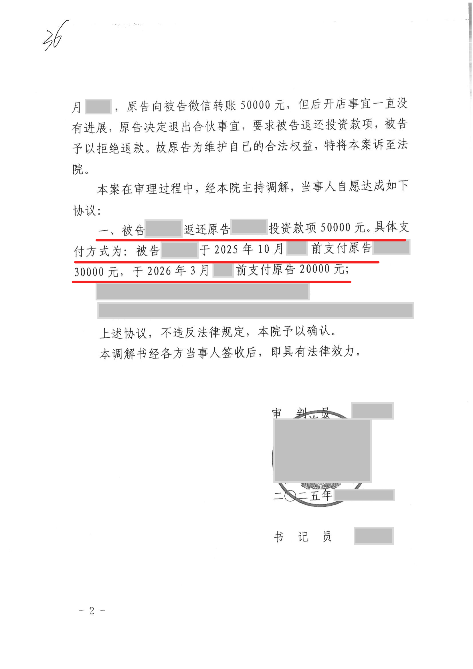 被告李先生返还原告唐女士投资款项50000元,具体支付方式为:被告李先生于2025年10月前支付原告唐女士30000元,于2026年3月前支付20000元;