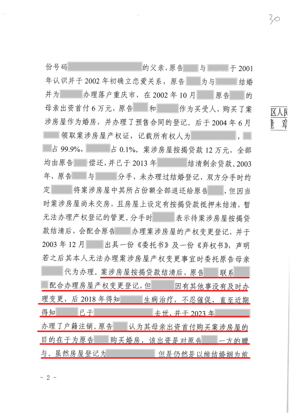 尤先生(化名)与章女士(化名)于2001年相识并确立恋爱关系。为筹备婚礼,2002年10月,尤先生的母亲出资6万元支付房屋首付款,尤先生与章女士作为共同买受人,购买了位于重庆市某区的一处房屋作为婚房,并办理了预售合同登记。2004年6月,该房屋产权证发放,登记的所有权人为尤先生和章女士,其中尤先生占99.9%的产权份额,章女士占0.1%。其中,房屋按揭贷款12万元全部由尤先生偿还,至2013年,剩余贷款已全部结清。