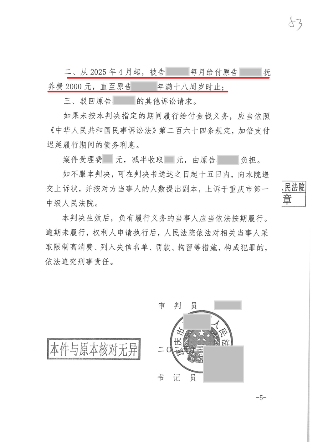 二、从2025年4月起,被告每月给付原告抚养费2000元,直至孩子年满十八周岁时止;