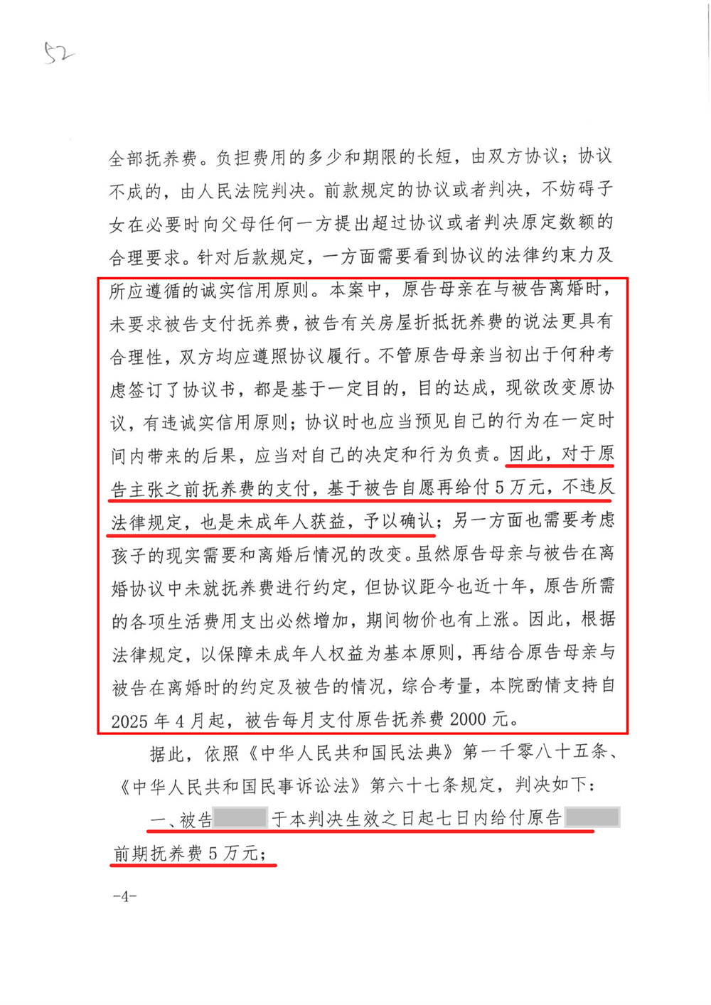 本案经人民法院开庭审理,原告张女士及其代理律师参与诉讼,庭审过程中,我方当事人当庭表示,愿意承担作为父亲应尽的责任,除去之前所支付的46000元抚养费外,再另行支付前期的抚养费50000元,对于2025年4月后的抚养费,每月也可支付相应的抚养费用。法院全面、细致地听取了双方当事人的陈诉和经审查确认的证据,认为:本案中,原告在与被告离婚时,未要求被告支付抚养费,被告有关房屋折抵抚养费的说法更具有合理性,双方均应遵照协议履行。不管原告当初出于何种考虑签订了协议书,都是基于一定目的,目的达成,现欲改变原协议,有违诚实信用原则;协议时也应当预见自己的行为在一定时间内带来的后果,应当对自己的决定和行为负责。因此,对于原告主张之前抚养费的支付,基于被告自愿再给付5万元,不违反法律规定,也是未成年人获益,予以确认;另一方面也需要考虑孩子的现实需要和离婚后情况的改变。虽然原告与被告在离婚协议中未就抚养费进行约定,但协议距今也近十年,原告所需的各项生活费用支出必然增加,期间物价也有上涨。因此,根据法律规定,以保障未成年人权益为基本原则,再结合原告与被告在离婚时的约定及被告的情况,综合考量,本院酌情支持自2025年4月起,被告每月支付原告抚养费2000元。最终法院判决如下: