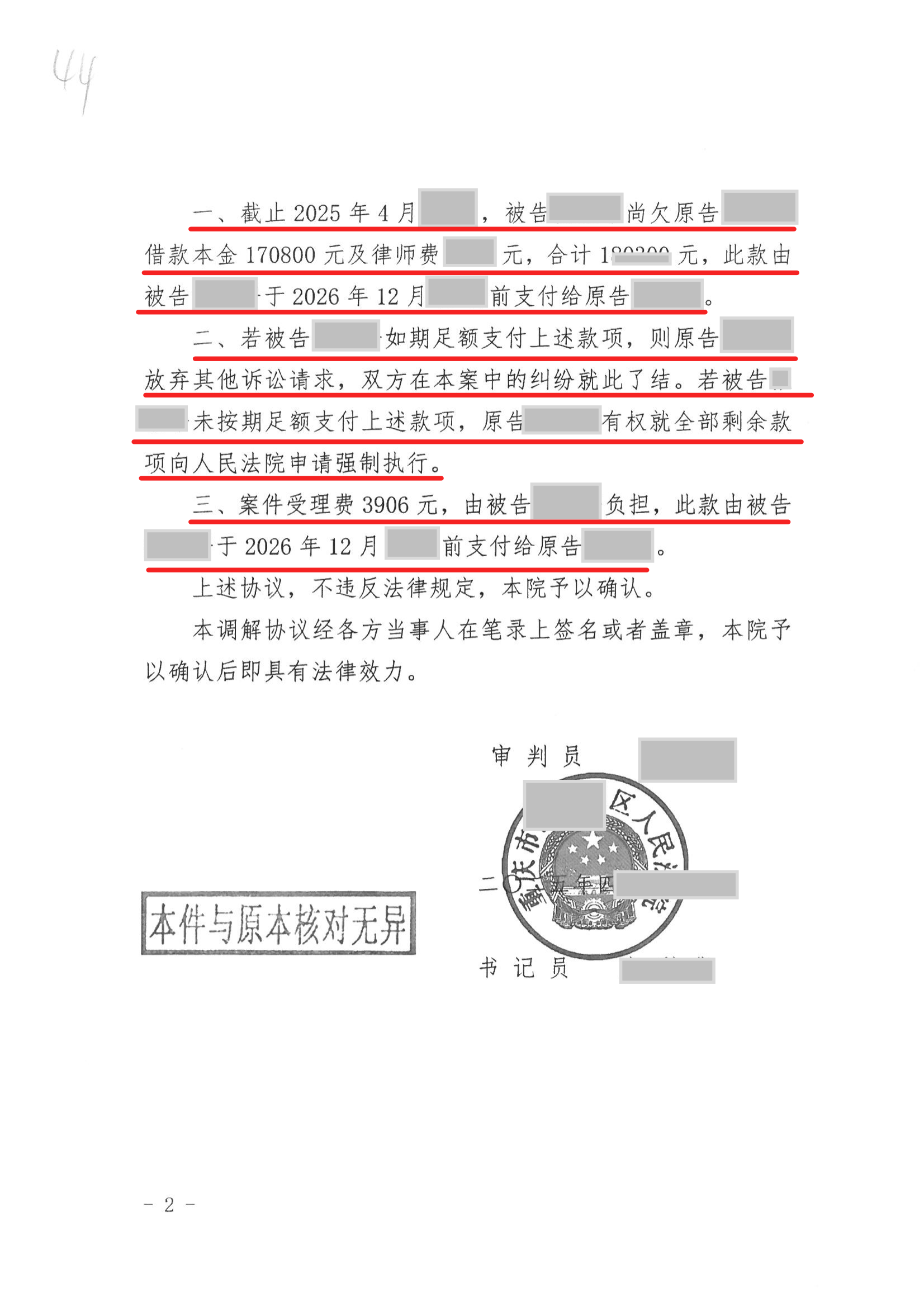 此调解结果明确限定了被告章先生的具体还款日期,若章先生未依照调解协议约定的时间足额支付款项,曾女士可依法就剩余全部金额向法院申请强制执行,切实保障了曾女士的合法权益。