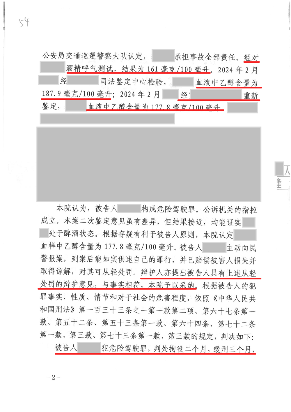 在明确检察官的量刑建议后,承办律师凭借丰富的辩护经验及庭前阅卷所获信息,认真听取了王先生的陈述与供述,对案件事实、证据及法律适用进行了全面、细致的剖析。基于上述分析,律师撰写了一审辩护词,提出以下辩护观点:应当本着有利于被告人的原则,以第二次血液鉴定报告作为本案的定罪依据。其一、公安局于2024年2月向被告人送达了司法鉴定中心司法鉴定意见书,血液乙醇含量为187.9mg/100ml,被告人对该鉴定意见书持异议并按程序要求在三个工作日内向公安局申请重新鉴定,公安局受理后于当月重新委托对被告人抽样血液重新鉴定,鉴定结果为乙醇含177.8mg/100ml, 形成第二次报告的程序合法,鉴定过程客观公正,鉴定结果真实有效。其二、根据《公安机关办理刑事案件程序规定》第255条对重新鉴定的规定,侦查机关与当事人达成合意重新鉴定的,在法理上也应视为对前面鉴定意见的放弃,否则无法解释为何要进行重新鉴定,重新鉴定就失去立法意图。