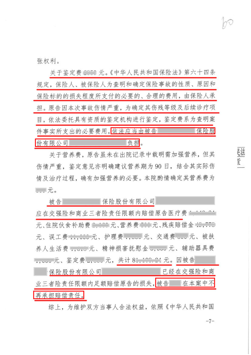 对此,承办律师据理力争,辩称:根据《中华人民共和国保险法》第六十四条的规定,保险人、被保险人为查明和确定保险事故的性质、原因和保险标的的损失程度所支付的必要的、合理的费用,由保险人承担。原告因本次事故伤情严重,为确定其伤残等级及后续诊疗项目,依法委托具有资质的鉴定机构进行鉴定,鉴定费系为查明案件事实所支出的必要费用,依法应当由被告保险公司负担。