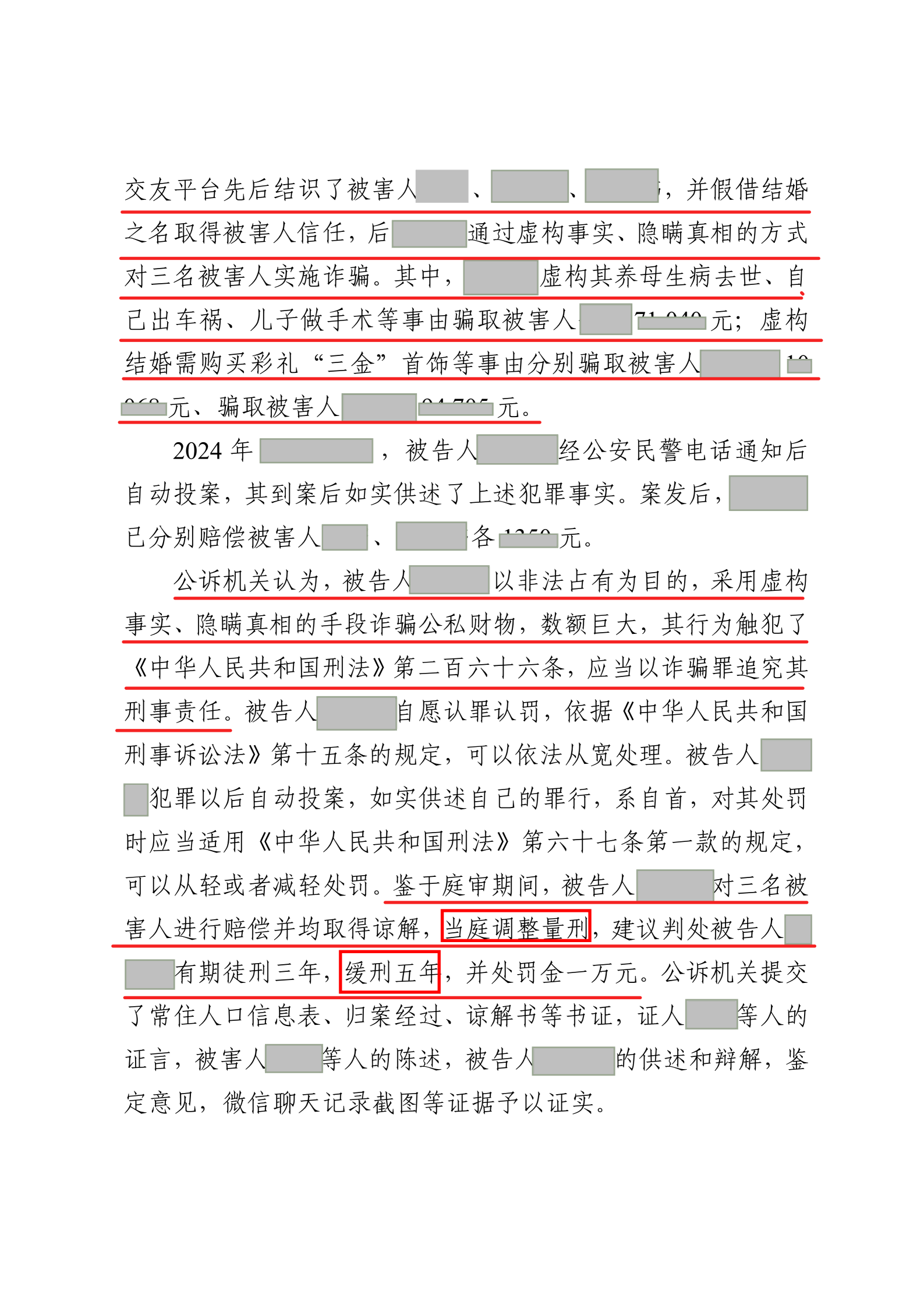 介入案件后,我们通过反复审阅卷宗,梳理每一笔转账背后复杂的情感与约定实质,找到当事人主观上确实是为了找一个适合的对象,只是牵扯到了经济往来;更重要的是,与承办法官进行了多轮深入、专业的沟通,清晰地呈现了本案在主观故意、非法占有目的等核心构成要件上的证据薄弱之处,以及对当事人适用缓刑的社会效果与法律依据。