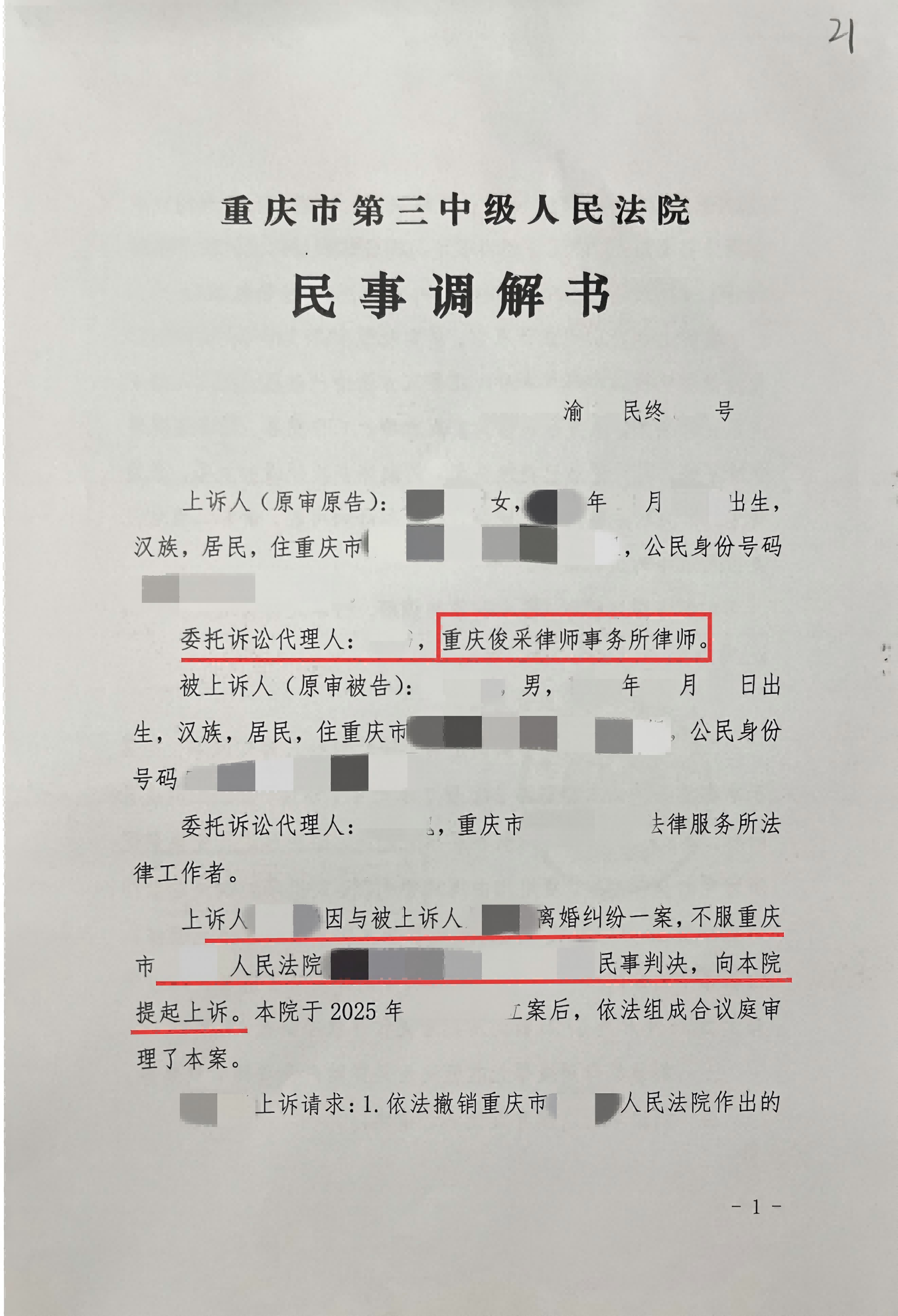 在婚姻家事法律纠纷的处理领域,专业能力与调解技巧至关重要。重庆俊采律师事务所婚姻家事部凭借其深厚的专业积淀与出色的调解能力,成功促成一起复杂的离婚纠纷案件达成和解。本案中,原告柳女士(化名)与被告邹先生(化名)因感情破裂,柳女士于25年3月向人民法院提起离婚诉讼。一审法院未判决离婚后,柳女士决定上诉至二审法院。在二审阶段,经本所资深律师的精心筹备与积极调解,双方最终达成和解,和平解除了婚姻关系,并就财产分割问题达成了妥善处理方案。