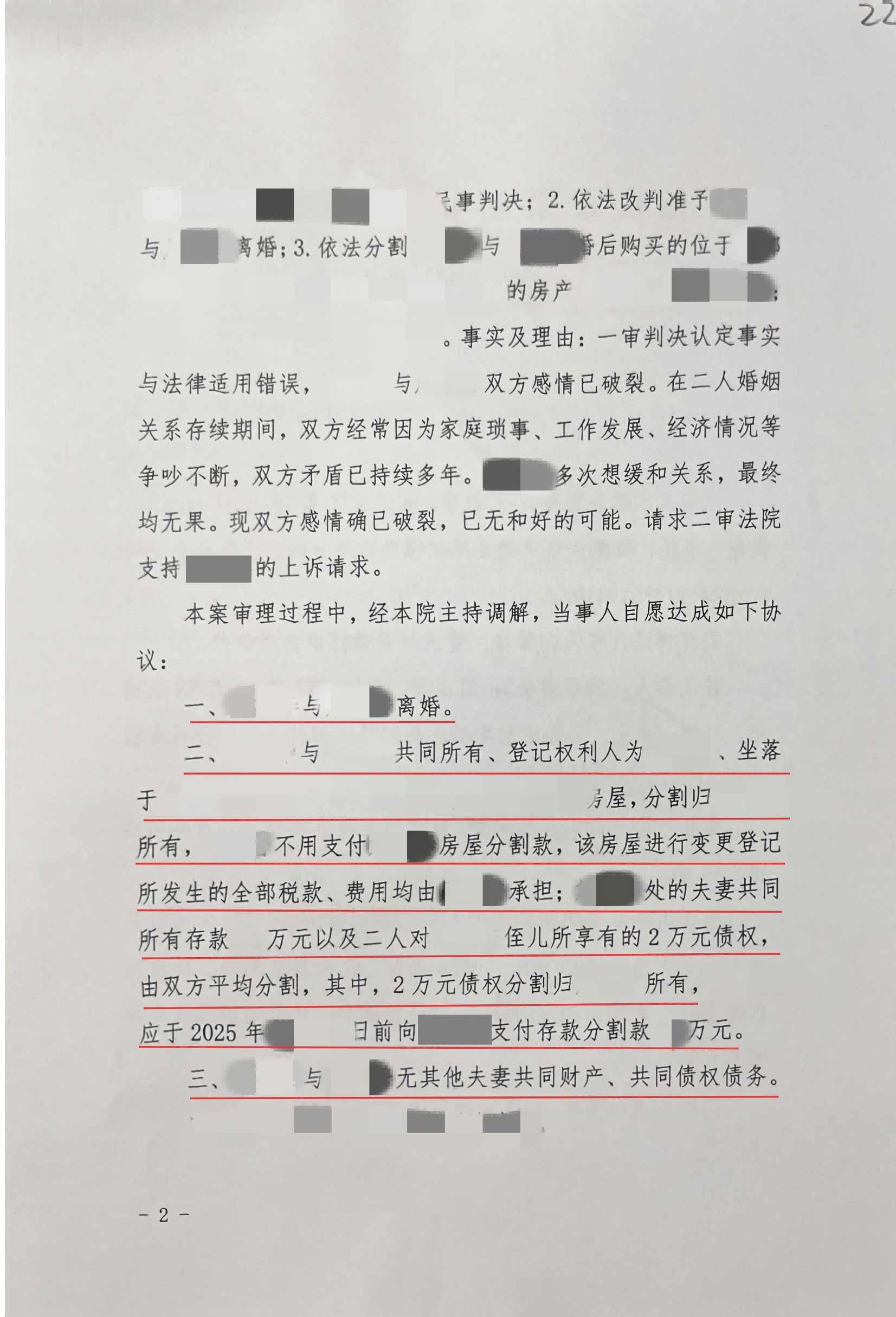 俊采离婚纠纷案例 | 一审未判离婚,二审调解圆满解决财产分割