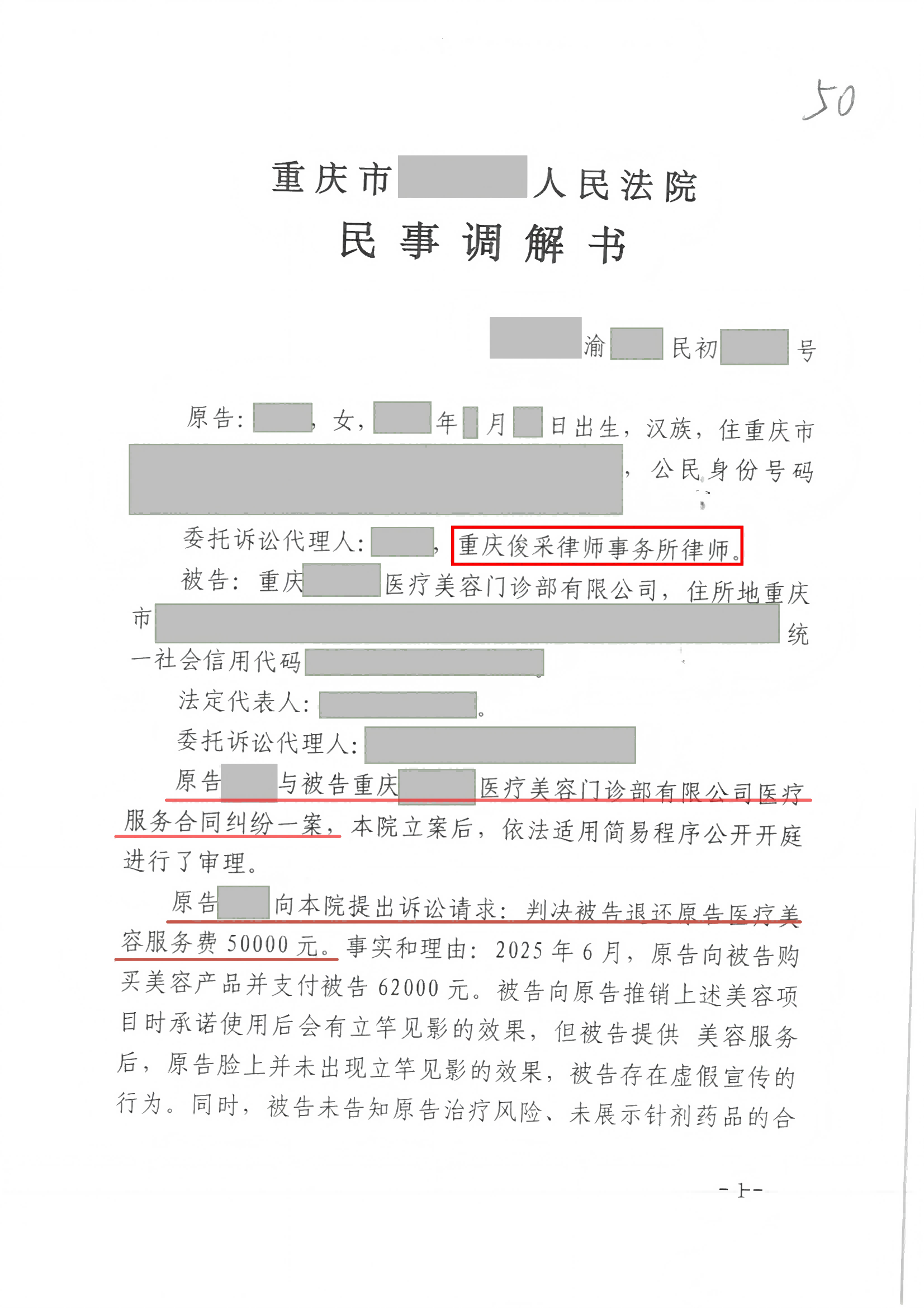 本案的委托人陆女士(化名)怀着变美的期望前往医院,不料却陷入了美容医院诱导消费的圈套。所幸,重庆俊采律师事务所合同纠纷部及时介入,推动案件成功调解,为陆女士追回了50000元的医疗美容服务费,有效维护了消费者的合法权益。