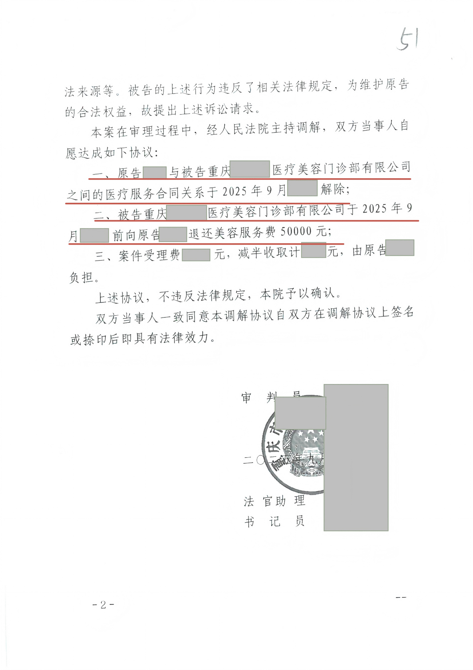 二、被告重庆市某医疗美容门诊部有限公司于2025年9 月前向陆女士退还美容服务费50000元;